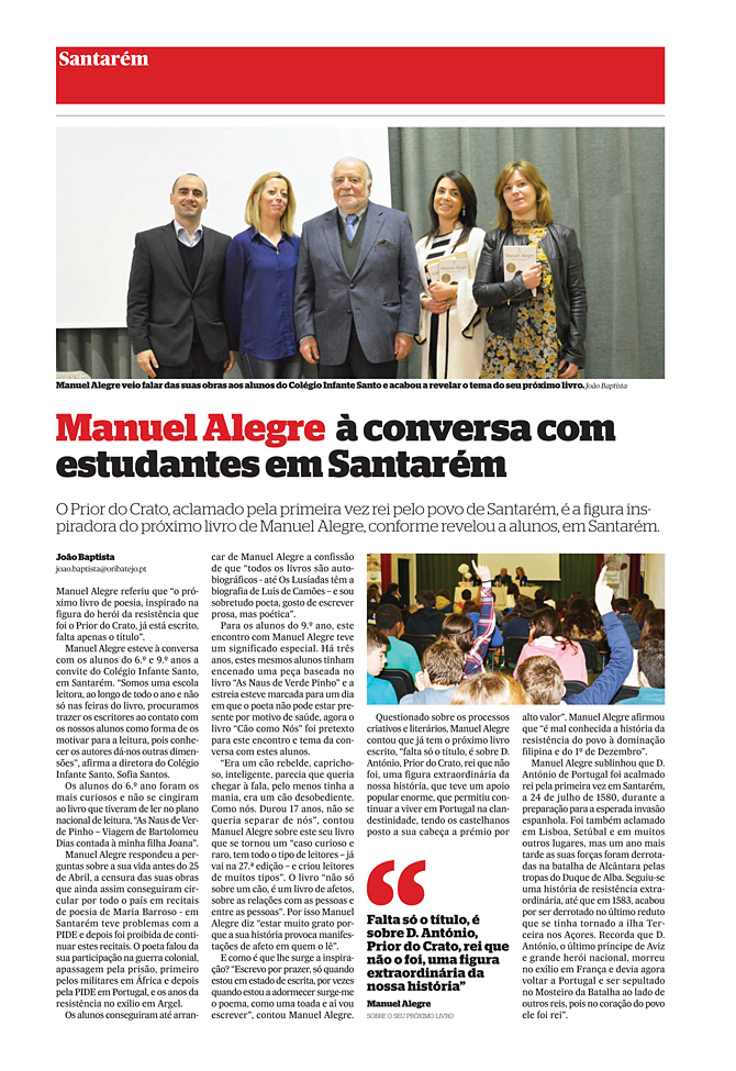O poeta Manuel Alegre visitou, no dia 23 de fevereiro, o Colégio Infante Santo, em Santarém, onde foi calorosamente recebido por alunos e professores.